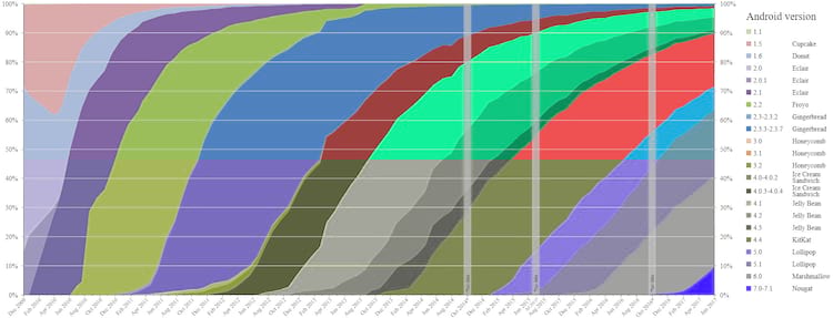 Em baixo apresentamos um gráfico que representa a percentagem de utilizadores de cada versão Android em agosto de 2017 e outro que ilustra a evolução das versões de Android ao longo dos tempos.